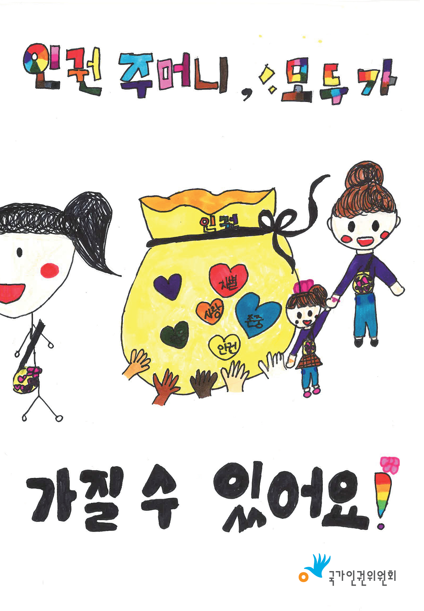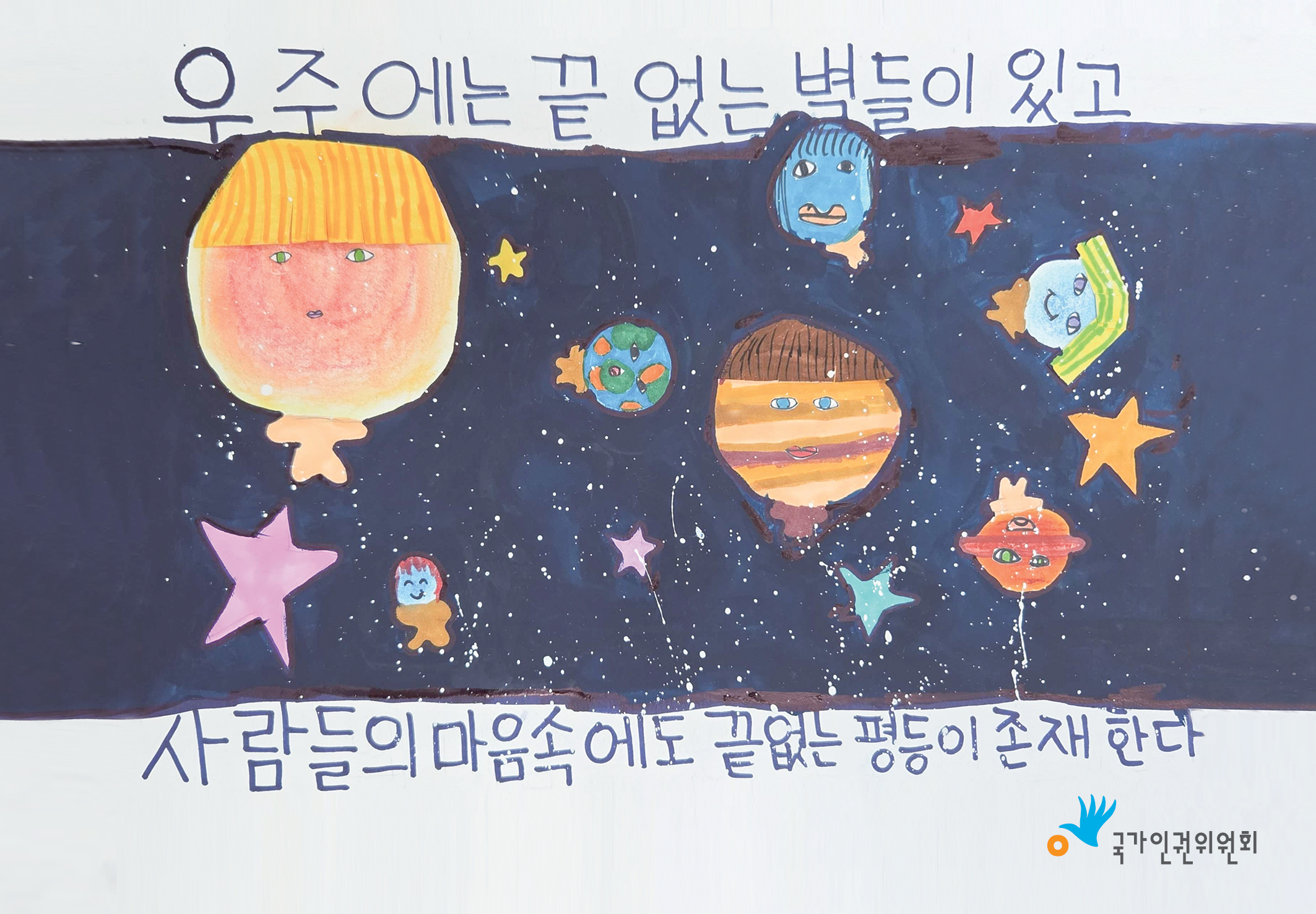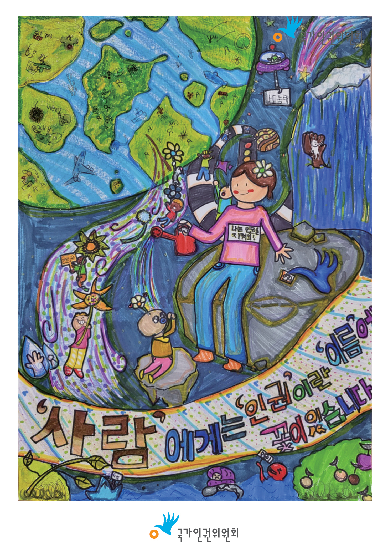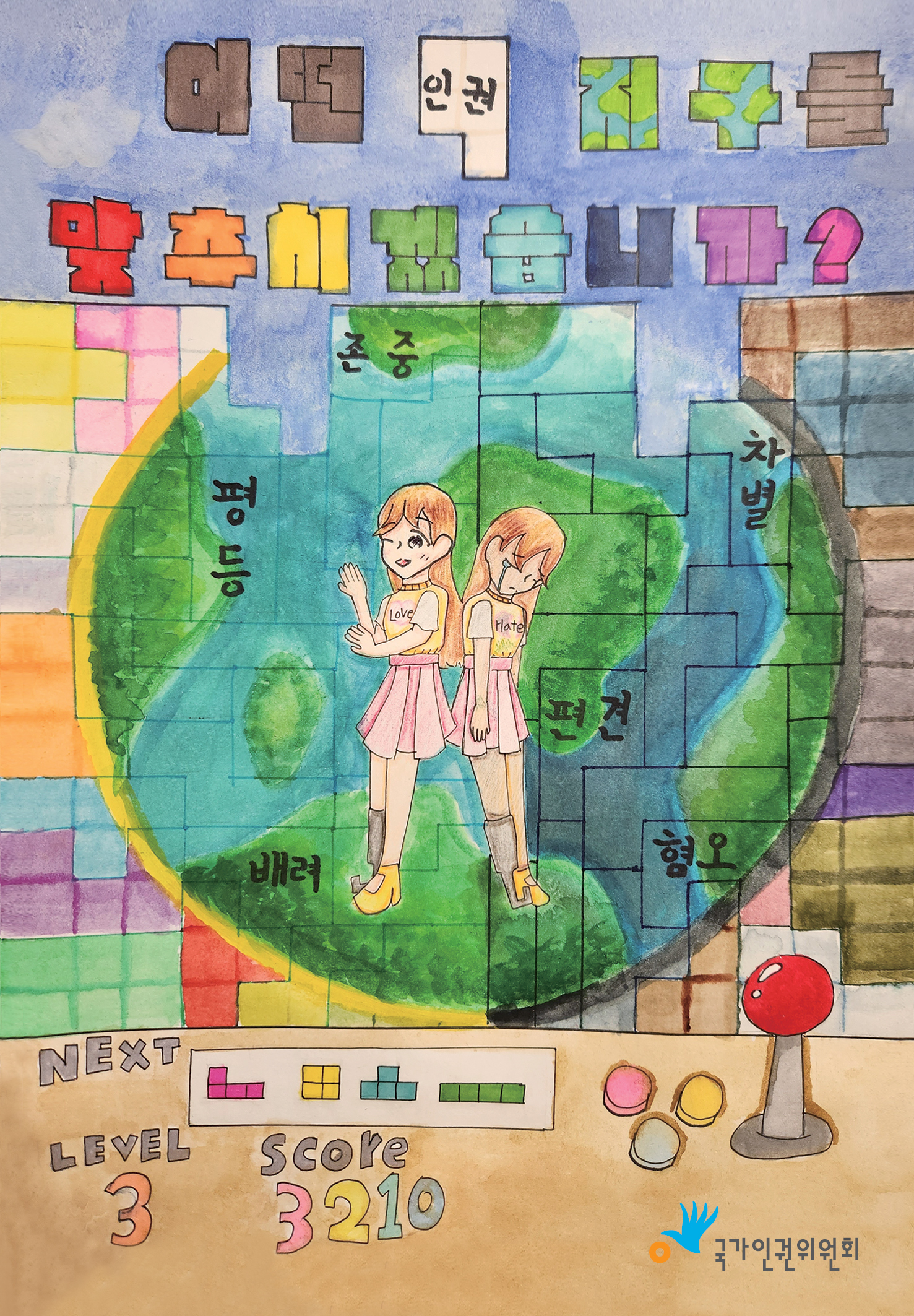 이 작품은 "인권 테트리스"라는 게임에서 지구를 맞추는 것을 표현한 그림입니다. 지구 한가운데에는 같은 조건을 가진 두 소녀가 그려져 있습니다. 소녀들의 조건은 같지만 오른쪽 편의 지구는 차별, 편견, 혐오로 맞추어진 지구이기 때문에 슬프고, 어두운 세상에 살고 있습니다. 반대로 왼쪽편의 지구는 존중, 평등, 배려 조각으로맞추어졌기 때문에 소녀는 행복하게 웃고 있습니다.