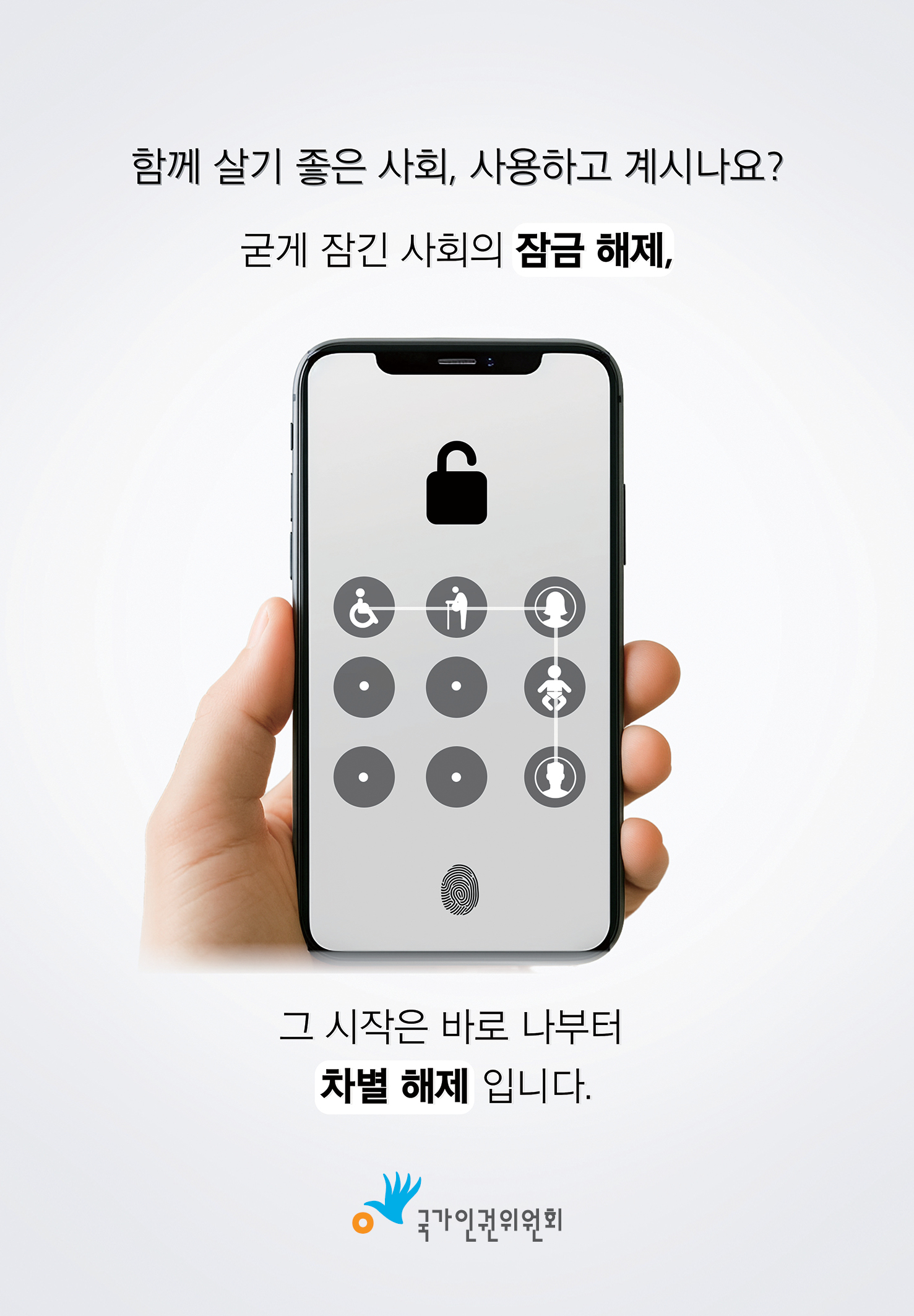 이 포스터는 장애인, 노인, 아이, 여성, 남성 등 우리 사회를 이루는 다양한 사람들을 스마트폰 잠금 패턴의 각 요소로 형상화했습니다. 이들이 차별 없이 동등하게 존중받고 연결될 때, 비로소 모두가 함께 사용할 수 있는 더 나은 사회가 열린다는 메시지를 담고 있습니다.