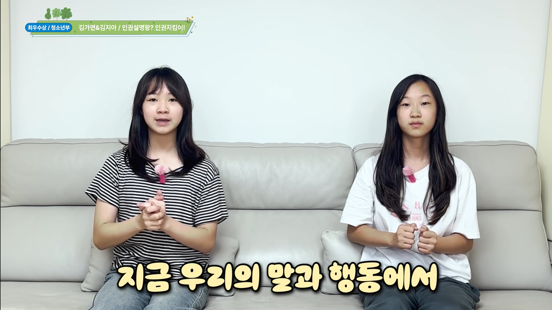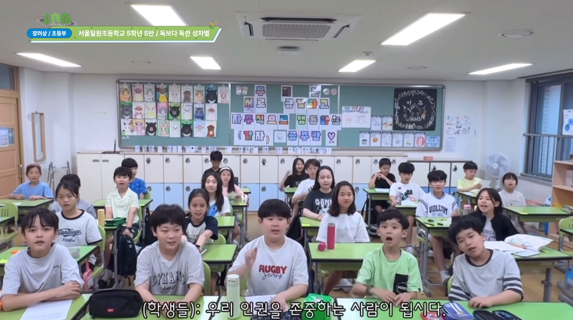 - 독보다 독한 성차별 (서울일원초(5-5)) 인권을 보장하기 위해서 어떤 노력을 할 수 있을 지에 대해서 아이들이 토의를 하였습니다. 이에 인권 의식을 개선할 수 있는 영상을 만들자는 의견이 가장 많은 동의를 얻어 단편 영화를 만들게 되었습니다. 아이들이 직접 영화 주제와 제목을 정하고, 대본을 작성하였습니다. 담임 선생님이 촬영을 하고, 영상 편집은 아이들이 하였습니다. 이 영화는 체육 시간에 벌어진 성차별적인 발언에 대해 학생들이 함께 목소리를 내며, 우리 주변에서 무심코 반복되는 성차별의 문제를 드러냅니다. 저희는 일상 속에서 쉽게 지나칠 수 있는 차별의 언어가 실제로는 누군가의 권리를 해칠 수 있음을 알리고, 우리 사회가 더 이상 성차별을 당연하게 여겨서는 안 되며, 모두가 평등한 존재로 존중받아야 한다는 메시지를 전달하고자 하였습니다.