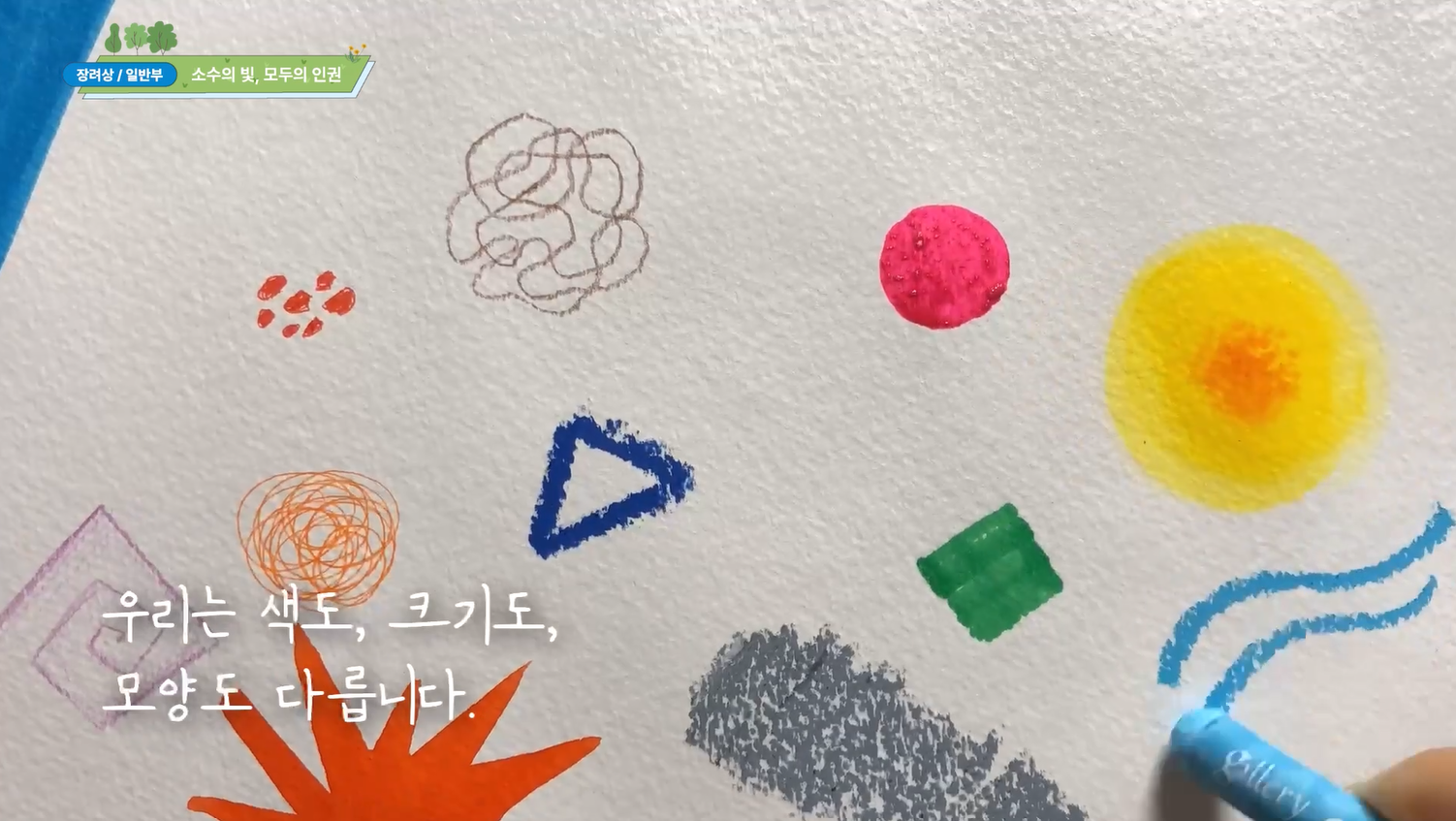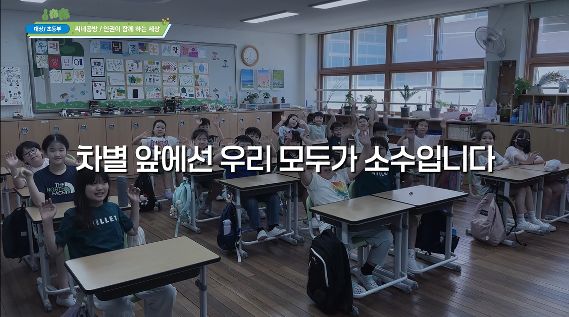 - 독보다 독한 성차별 (서울일원초(5-5)) 인권을 보장하기 위해서 어떤 노력을 할 수 있을 지에 대해서 아이들이 토의를 하였습니다. 이에 인권 의식을 개선할 수 있는 영상을 만들자는 의견이 가장 많은 동의를 얻어 단편 영화를 만들게 되었습니다. 아이들이 직접 영화 주제와 제목을 정하고, 대본을 작성하였습니다. 담임 선생님이 촬영을 하고, 영상 편집은 아이들이 하였습니다. 이 영화는 체육 시간에 벌어진 성차별적인 발언에 대해 학생들이 함께 목소리를 내며, 우리 주변에서 무심코 반복되는 성차별의 문제를 드러냅니다. 저희는 일상 속에서 쉽게 지나칠 수 있는 차별의 언어가 실제로는 누군가의 권리를 해칠 수 있음을 알리고, 우리 사회가 더 이상 성차별을 당연하게 여겨서는 안 되며, 모두가 평등한 존재로 존중받아야 한다는 메시지를 전달하고자 하였습니다.