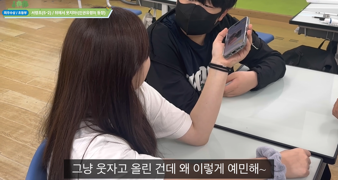 - 뒤에서 웃지마!(인권유령의 등장) (서령초(5-2)) 저희가 만든 작품은 일상 속에서 저희가 직접 보장할 수 있는 인권에 어떤 것이 있는지, 또 잘 지켜지지 않는 인권에 어떤 것이 있는지에 대한 고민으로부터 시작되었습니다. 인권을 보장할 수 있는 방법은 여러가지가 있지만, 저희는 진정한 인권존중의 첫걸음은 지금 우리 곁에 있는 사람에 대한 존중으로부터 출발한다고 생각하였습니다. 따라서 친구들과 인터뷰를 하여, 평소에 어떤 일을 겪었을 때 자신의 인권이 존중되지 않는 것 같다고 느끼는지 물었습니다. 놀랍게도 대부분의 대답은 학교에서 친구에게 들었던 말이나 행동과 관련이 있었습니다. 저희는 이러한 일상 속 말과 행동으로 서로의 인권을 침해하는 것에 대한 경각심을 일깨우고자, 서로의 인권을 침해할때마다 나타나는 '인권유령'을 생각해냈습니다. 다함께 대본을 만들고, 인권 유령이 언제 나타나야 할지 이야기를 하며 평소 자신의 행동에 대해 깊이 반성했습니다. 인권유령을 어떻게 표현할지 상의하며 다함께 웃음꽃을 피우며 인권의 의미를 되새겼습니다.
