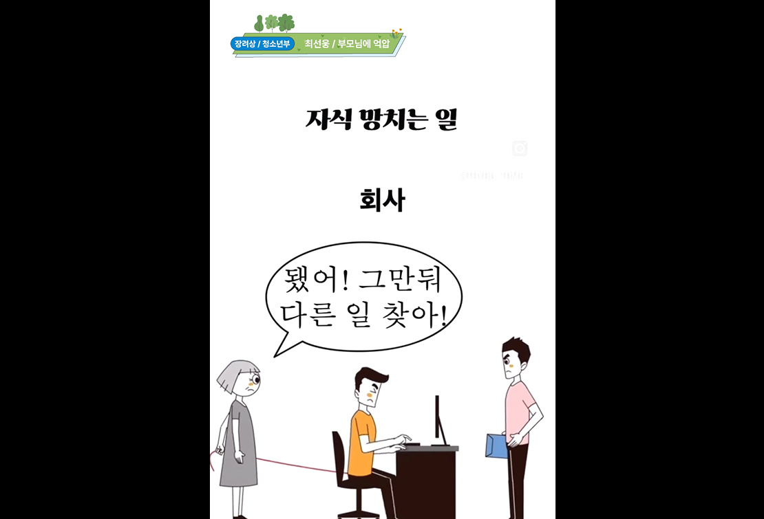 - 나는 사람입니다 학교에서 동성애자 차별과 학교폭력을 다루는 작품입니다. 주인공 소민은 평소 믿고있던 친구인 민서에게 다른반의 여자아이 서현을 좋아한다며 비밀을 털어놓지만, 민서는 그것을 약점으로 삼아 조롱하며 소민을 교묘하게 괴롭힙니다. 아이들은 민서의 행동에 따라 소민을 다같이 따돌렸고, 결과적으로 서현까지 소민을 외면하며 소민은 마음의 상처를 얻게 됩니다. 위 상황들이 전개되며 소민은 진정 자신이 가치있는 인간이 맞는가에 대해 갈등하며 자신을 무언가로 칭하지 못하고 노이즈로 남아있게됩니다. 하지만, 소민은 이러한 고난속에서도 자신의 정체성과 자주성을 지키며 자신을 '사람'이라고 칭하게됩니다. 결국 동성애자는 뭔가 특이한 존재, 우리와 다르니까 틀린 존재가 아닌 우리와 같은 그저 한 인간이라는 것을 나타내고있습니다. 이렇게 마지막 "나는 사람입니다"라는 문구를 통하여 소민의 밝은 미래를 암시하며 영상은 끝이 납니다.